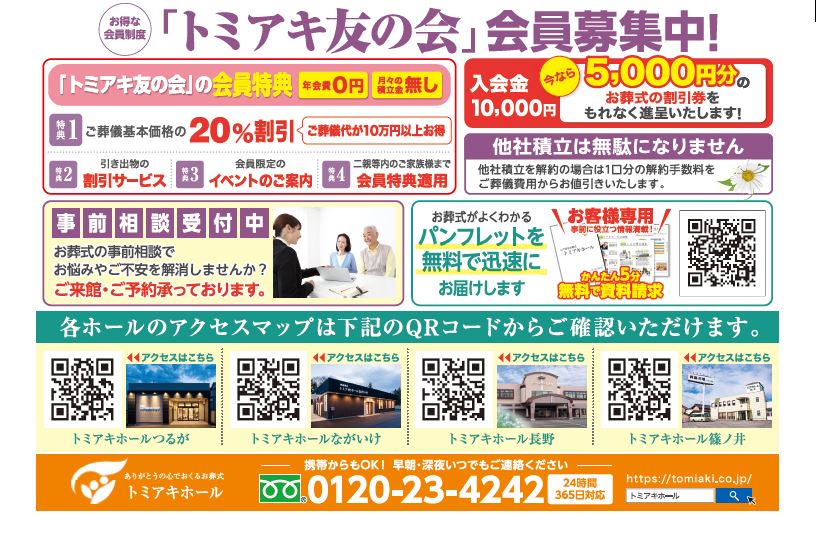 長野県・長野市のご葬儀はスタッフがまごころを込めて対応させていただきます。葬儀費用のこと、いろいろな葬儀のかたち、会場のこと、お料理、引き出物のこと…。葬儀を行うにあたって、どんな些細なことでも、トミアキにご相談ください。
