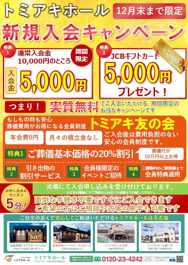 トミアキ友の会ご入会キャンペーン実施中です 今回のキャンペーンは入会金が半額の5,000円・さらに5,000円分のJCBのギフト券をプレゼント!実質無料でご入会いただけるお得なキャンペーンです。期間は12月31日までです。 トミアキ友の会は …