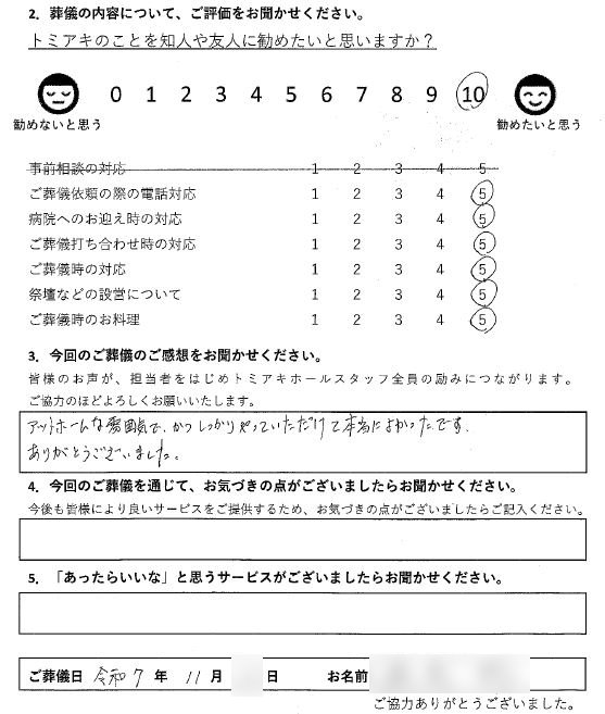 今回の御葬儀の感想をお聞かせください 「大変に良かったです。ありがとうございました」 今回の御葬儀を通じてお気づきの点がございましたらお聞かせください 「特にありません」 あったらいいなと思うサービスがございましたらお聞かせください 「特に …