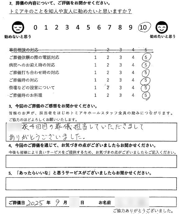 2025年9月トミアキホール長野にて一般葬施行T様 2025年9月トミアキホール長野にて一般葬施行T様 T家4回目の葬儀担当をしていただきまして ありがとうございました 2025年9月トミアキホール長野にて一般葬施行T家様